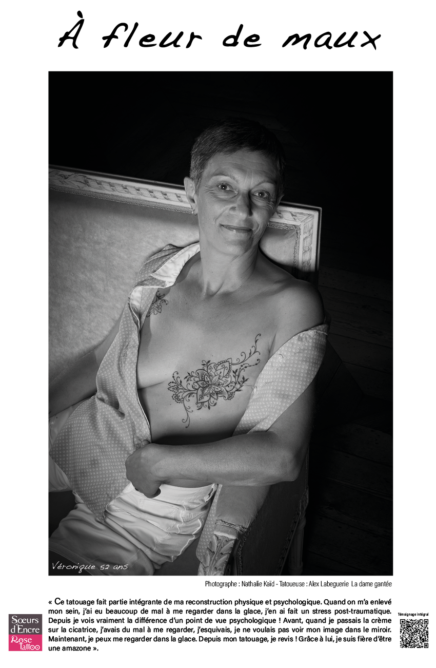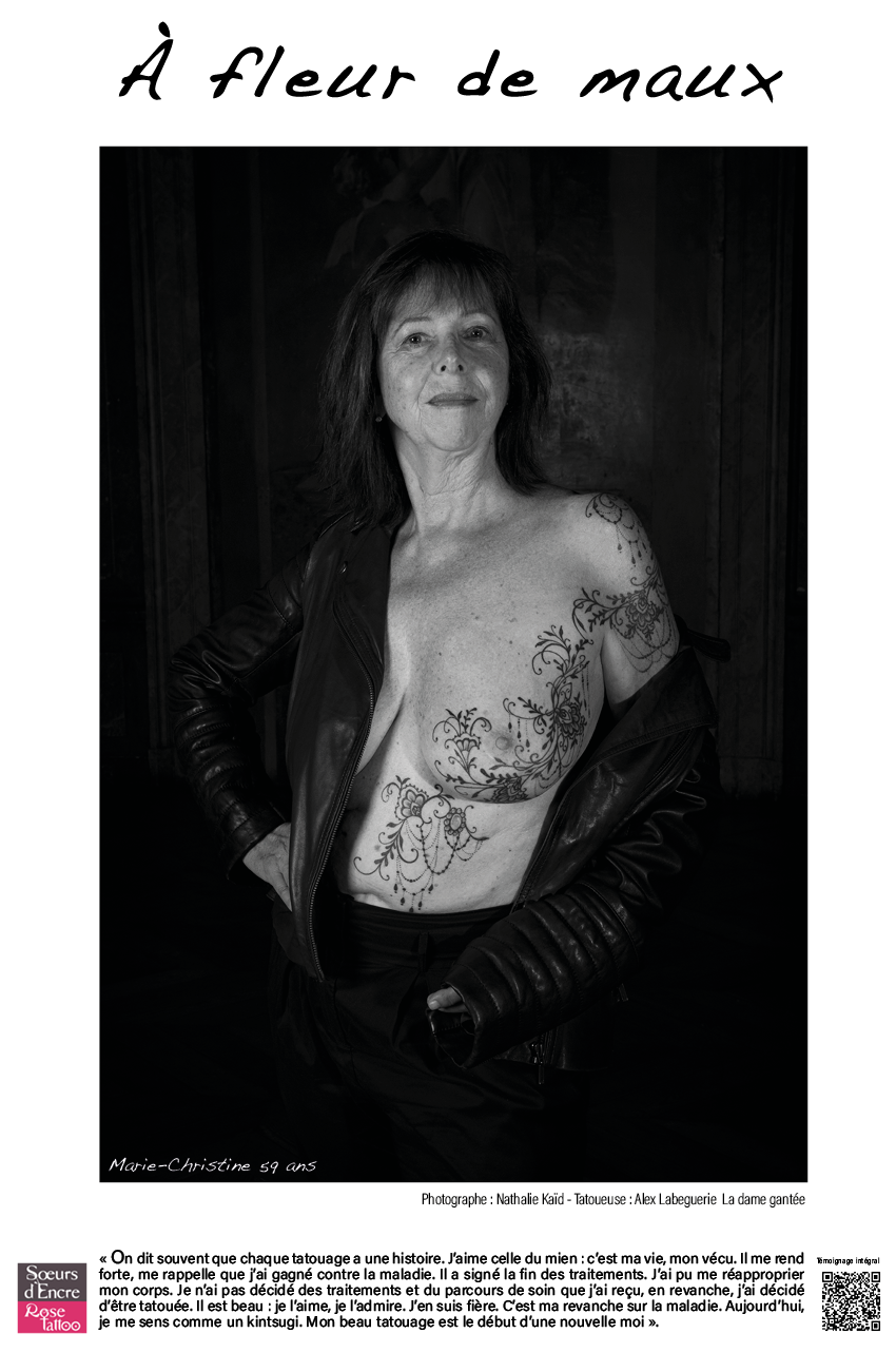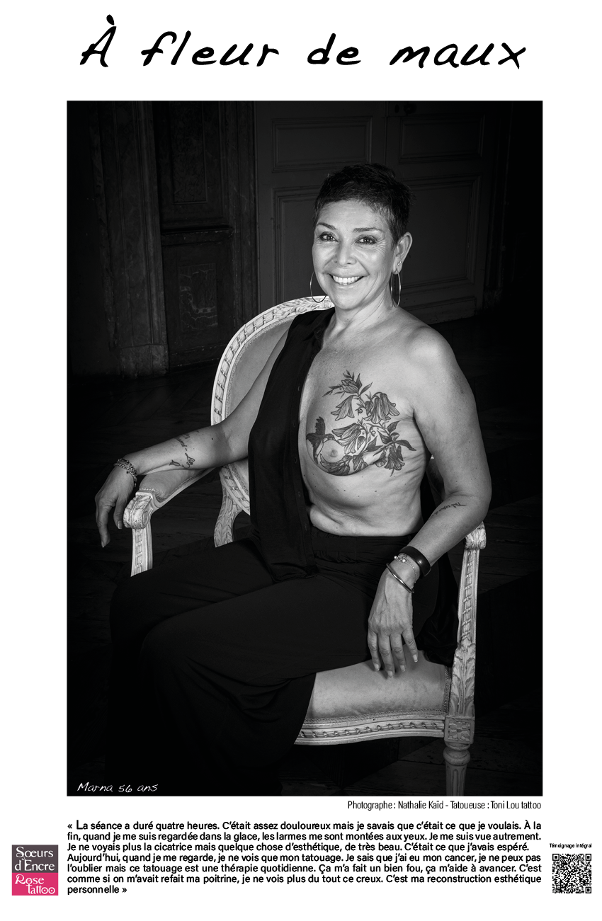 Nathalie Kaïd, tatouée, photographe et Fondatrice de l’association Sœurs d'Encre, explore les territoires de l’émotion, du corps et de la mémoire. Elle met en lumière le corps féminin depuis 44 ans et se consacre depuis 15 ans aux photos-témoignages pour raconter les parcours de vie des femmes. Le corps et la féminité sont ses sources d’inspiration. Avec le projet de photos-témoignages À fleur de Maux, elle propose un voyage émotionnel engagé, où la vulnérabilité devient force, et le regard, un geste de réparation. Cette exposition est centrée sur le tatouage artistique de reconstruction post-mastectomie, thématique centrale de l’association *Sœurs d'Encre. Elle permet d’apporter un nouveau regard sur la reconstruction - physique et psychologique - après un cancer du sein. « Mes photographies offrent un autre regard sur le tatouage : elles ouvrent la voie à une nouvelle forme de reconstruction physique après le deuil d’un ou deux seins. Ce qui m’émeut profondément, c’est le nouveau regard que ces femmes portent sur leur corps tatoué. J’ai voulu capturer leur joie et la beauté de leurs bustes sublimés. Par l’image, je m’engage pour que demain, chaque femme touchée par un cancer du sein ait le droit de choisir sa reconstruction, librement et sans compromis. Un immense merci à toutes les femmes qui se sont dévoilées devant mon objectif . Les femmes tatouées après un cancer du sein peuvent se réapproprier leur corps et reprendre confiance en elles grâce aux dessins des tatoueuses, engagées dans l’association Sœurs d'Encre. Cela permet une acceptation du sein perdu ou transformé, et pour certaines, de mettre un point final à la maladie. Pour beaucoup, le tatouage permet de réinventer leur féminité. Les prises de vue ont été réalisées dans les salons de l’Hôtel de Ville de Bordeaux. Durant quatre jours, les femmes tatouées, pleines de vie et de joie, se sont dévoilées corps et âme. Par leurs expériences et leurs témoignages, elles montrent que le tatouage, au-delà d’un bel habillage, peut-être une reconstruction à part entière, au même titre que la chirurgie réparatrice. Elles se sentent de nouveau belles, bombent le buste, et retrouvent une vie intime : les stigmates de la maladie sont toujours présents, mais le tatouage les occulte, ne laissant apparaître que la beauté des femmes. Cette exposition a été réalisée en partenariat avec la Ville de Bordeaux - la direction des solidarités et de la citoyenneté et la direction de la promotion et de la prévention de la santé - que nous remercions chaleureusement pour leur engagement dans un objectif de sensibilisation au dépistage du cancer du sein. *L’association Sœurs d'Encre est reconnue comme soin oncologique de support par l’AFSOS (Association Francophone des Soins Oncologiques de Support). Elle travaille en partenariat exclusif avec la CPAM de la Gironde et de Eure et Loir, est soutenue par l’AGEFIPH (Association de Gestion du Fonds pour l’Insertion Professionnelle des Personnes Handicapées), et est lauréate 2021 du Prix Ruban Rose Qualité de Vie et, en 2022, du trophée « Les Lumières de la Santé » (3e prix mutuelle Viasanté).