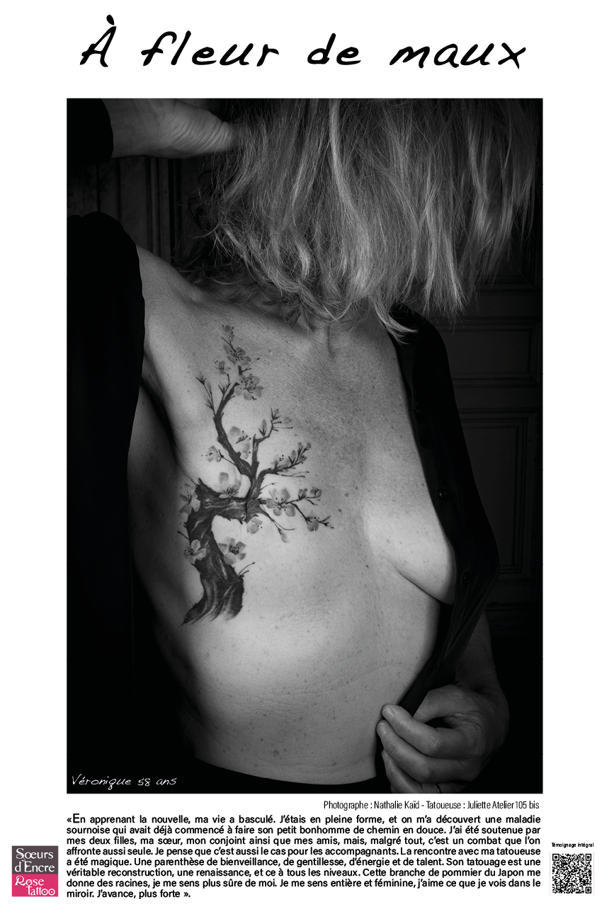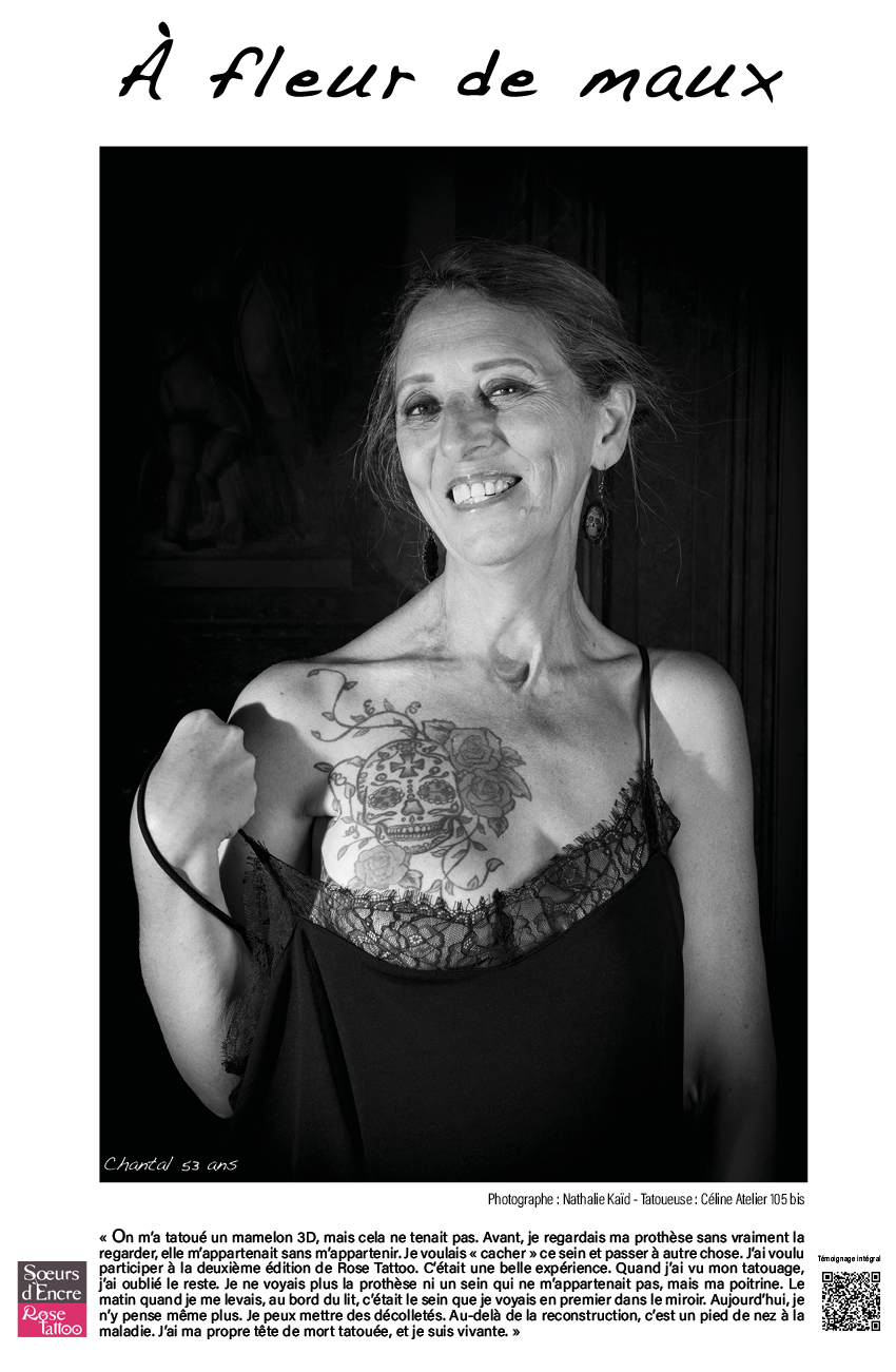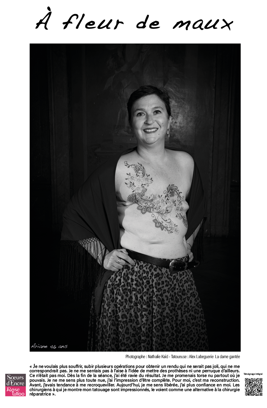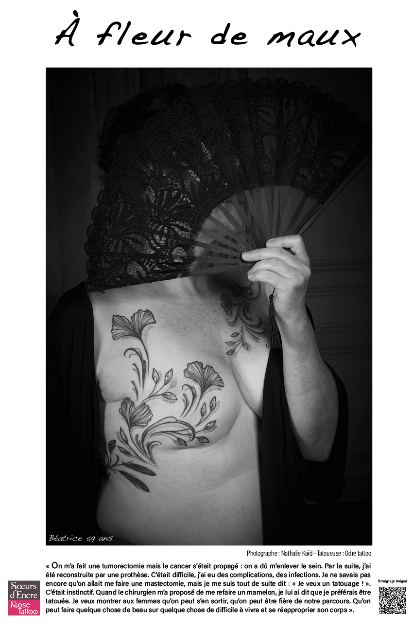 Nathalie Kaïd, tatouée, photographe et Fondatrice de l’association Sœurs d'Encre, explore les territoires de l’émotion, du corps et de la mémoire. Elle met en lumière le corps féminin depuis 44 ans et se consacre depuis 15 ans aux photos-témoignages pour raconter les parcours de vie des femmes. Le corps et la féminité sont ses sources d’inspiration. Avec le projet de photos-témoignages À fleur de Maux, elle propose un voyage émotionnel engagé, où la vulnérabilité devient force, et le regard, un geste de réparation. Cette exposition est centrée sur le tatouage artistique de reconstruction post-mastectomie, thématique centrale de l’association *Sœurs d'Encre. Elle permet d’apporter un nouveau regard sur la reconstruction - physique et psychologique - après un cancer du sein. « Mes photographies offrent un autre regard sur le tatouage : elles ouvrent la voie à une nouvelle forme de reconstruction physique après le deuil d’un ou deux seins. Ce qui m’émeut profondément, c’est le nouveau regard que ces femmes portent sur leur corps tatoué. J’ai voulu capturer leur joie et la beauté de leurs bustes sublimés. Par l’image, je m’engage pour que demain, chaque femme touchée par un cancer du sein ait le droit de choisir sa reconstruction, librement et sans compromis. Un immense merci à toutes les femmes qui se sont dévoilées devant mon objectif . Les femmes tatouées après un cancer du sein peuvent se réapproprier leur corps et reprendre confiance en elles grâce aux dessins des tatoueuses, engagées dans l’association Sœurs d'Encre. Cela permet une acceptation du sein perdu ou transformé, et pour certaines, de mettre un point final à la maladie. Pour beaucoup, le tatouage permet de réinventer leur féminité. Les prises de vue ont été réalisées dans les salons de l’Hôtel de Ville de Bordeaux. Durant quatre jours, les femmes tatouées, pleines de vie et de joie, se sont dévoilées corps et âme. Par leurs expériences et leurs témoignages, elles montrent que le tatouage, au-delà d’un bel habillage, peut-être une reconstruction à part entière, au même titre que la chirurgie réparatrice. Elles se sentent de nouveau belles, bombent le buste, et retrouvent une vie intime : les stigmates de la maladie sont toujours présents, mais le tatouage les occulte, ne laissant apparaître que la beauté des femmes. Cette exposition a été réalisée en partenariat avec la Ville de Bordeaux - la direction des solidarités et de la citoyenneté et la direction de la promotion et de la prévention de la santé - que nous remercions chaleureusement pour leur engagement dans un objectif de sensibilisation au dépistage du cancer du sein. *L’association Sœurs d'Encre est reconnue comme soin oncologique de support par l’AFSOS (Association Francophone des Soins Oncologiques de Support). Elle travaille en partenariat exclusif avec la CPAM de la Gironde et de Eure et Loir, est soutenue par l’AGEFIPH (Association de Gestion du Fonds pour l’Insertion Professionnelle des Personnes Handicapées), et est lauréate 2021 du Prix Ruban Rose Qualité de Vie et, en 2022, du trophée « Les Lumières de la Santé » (3e prix mutuelle Viasanté).